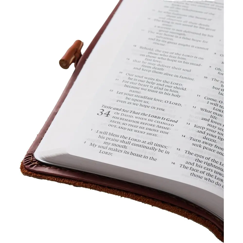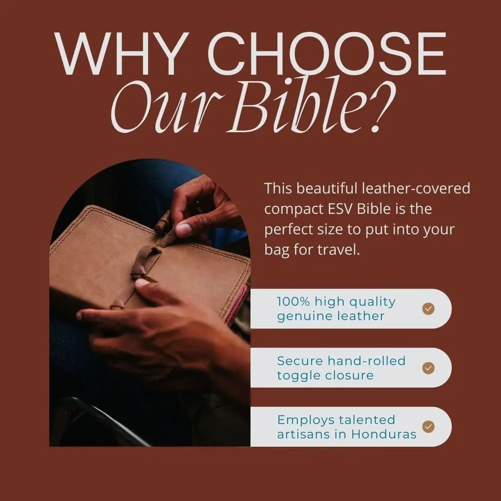 Genuine Leather Craftsmanship – Our product is meticulously hand-stitched using 100% genuine leather, ensuring both durability and a classic aesthetic that stands the test of time. Trusted ESV Translation – We offer the reliable and easy-to-read English Standard Version, making it perfect for in-depth study and daily spiritual reflection. Elegant Pull-Tie Closure – This feature not only secures the pages but also adds a sophisticated, handcrafted element to the overall design. Handcrafted in Honduras – Each item is uniquely crafted, showcasing natural variations that highlight the authenticity of artisanal craftsmanship. Portable & Gift-Ready – With a compact 6 × 9 size, our product is easy to carry and fits conveniently in bags, making it an ideal choice for travel, attending church, or as a considerate gift.